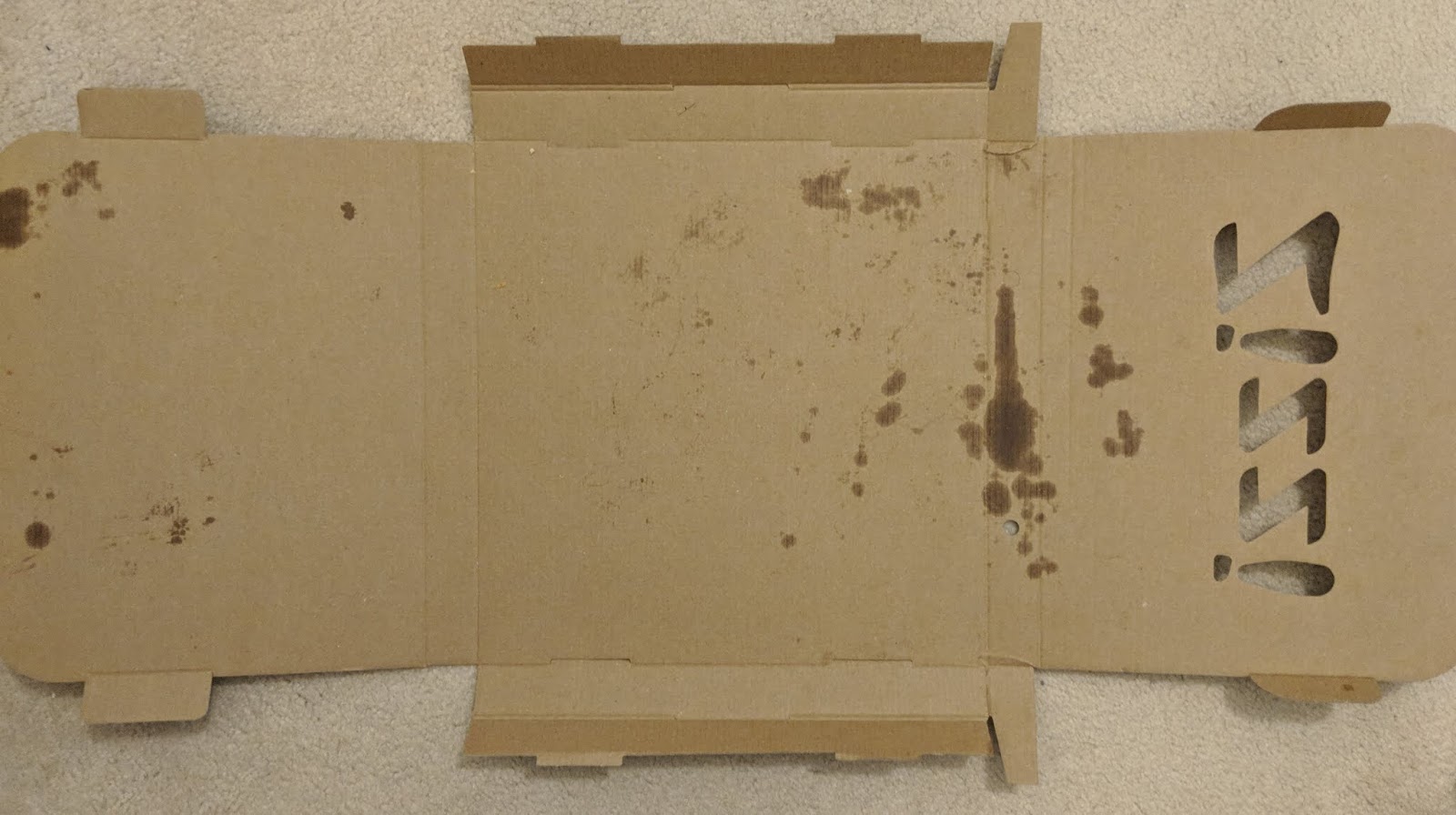 First of all, the net of the box (ignore the grease on mine) was different to any other I'd seen before. Zizzi employs a flap on the top half of their box. I thought this was a nice touch as it sets them apart from other pizza boxes without using too much extra material or effort.
